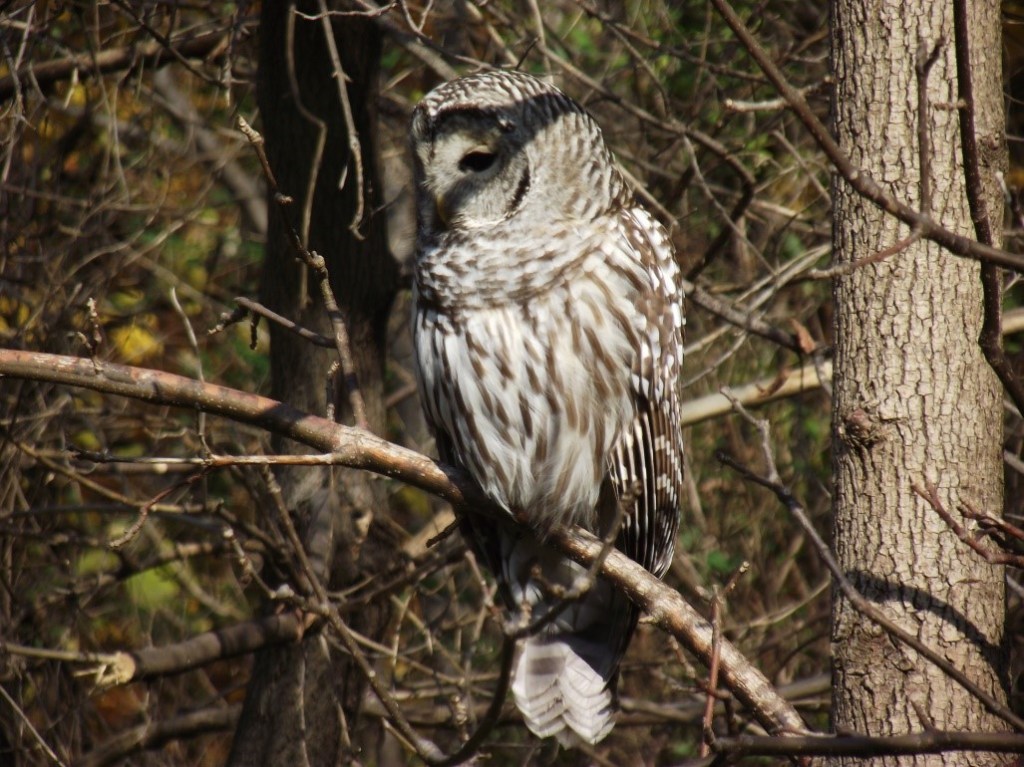 Up a slight incline, and you will notice warning signs that you are passing over the oil and gas pipelines that feed the energy needs of Toronto. Next, you will see a branch of the trail to the right; keep left as the right-hand trail leads to a residential neighbourhood. Just past this intersection, the city has constructed a beautiful pond to conserve water and to attract wildlife. You never know what birds and animals you might spy there. Is that a Barred Owl?
