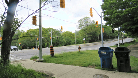 Continuing the walk, we arrive at Mt. Pleasant Road, where the official speed limit 60 km/h, but nobody drives that slowly. Luckily for walkers, the city has installed traffic lights for those wishing to continue on the other side of Mt. Pleasant.