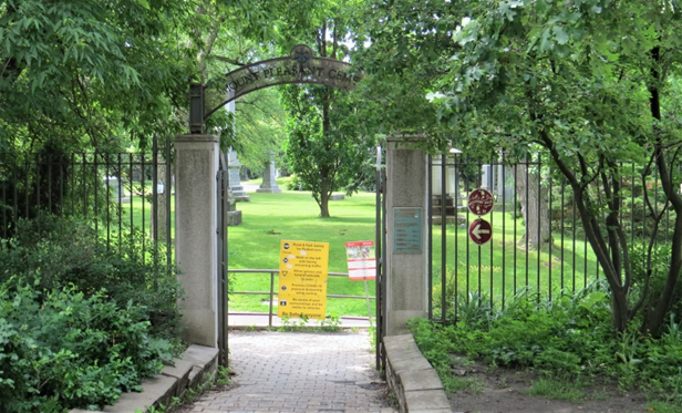 Take the subway to Davisville, walk south two blocks on the east side of Yonge St. Take the stairs at the bridge up to the Belt Line trail and walk one block east to the cemetery entrance. Note the horses on the bridge!