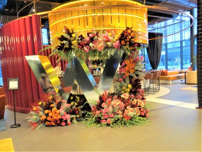 We started our tour at the Hotel W, which is on Bloor St. just east of the former Bay store. The information that I had said to proceed to the sixth floor, which we did. The elevators opened onto an open area with a bar, terrace and restaurant. In the middle was our first item to view. (All displays had a number and a card showing the title and the plants involved in their creation.) There we also received copies of the official brochure with a walking map showing the location of each installation.