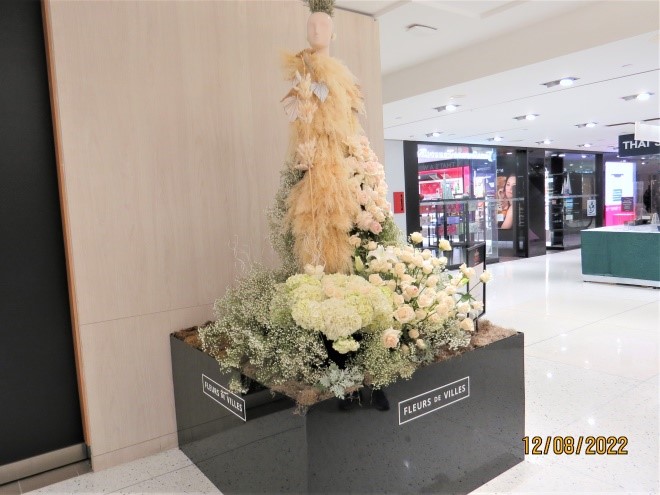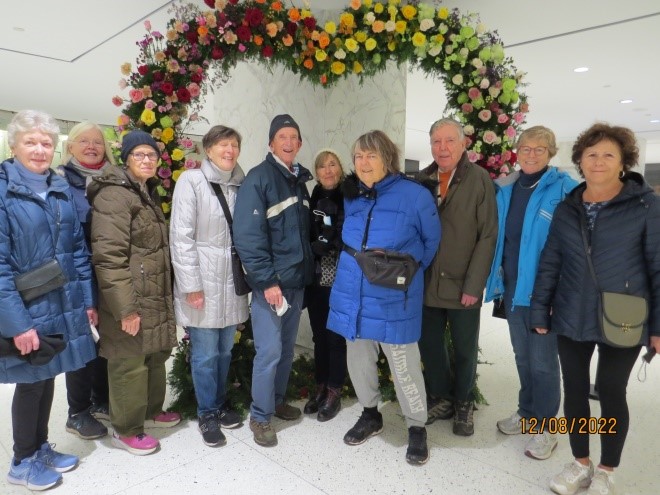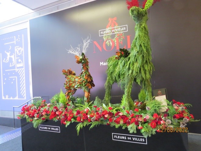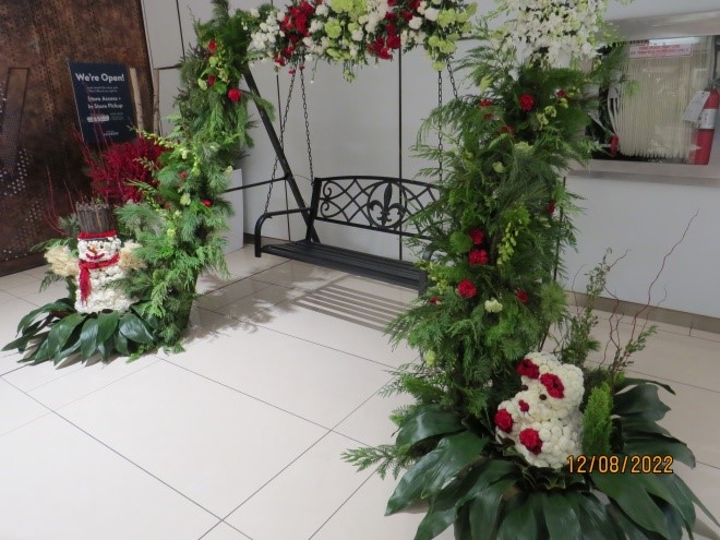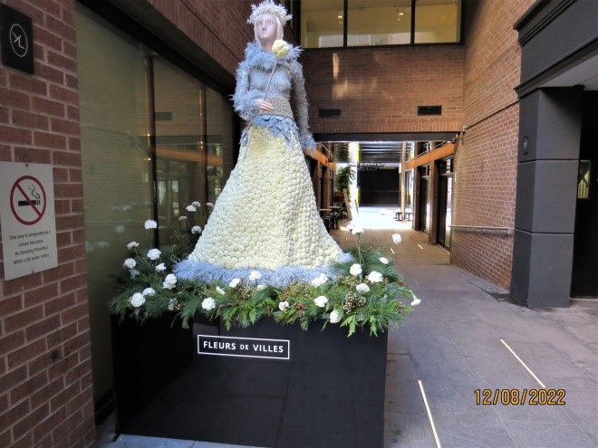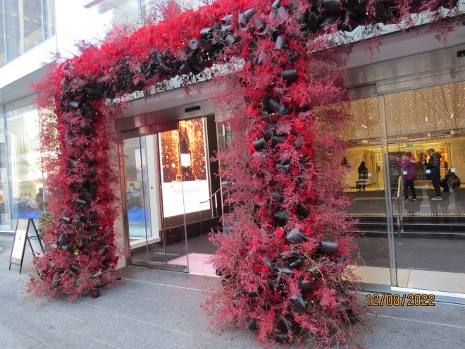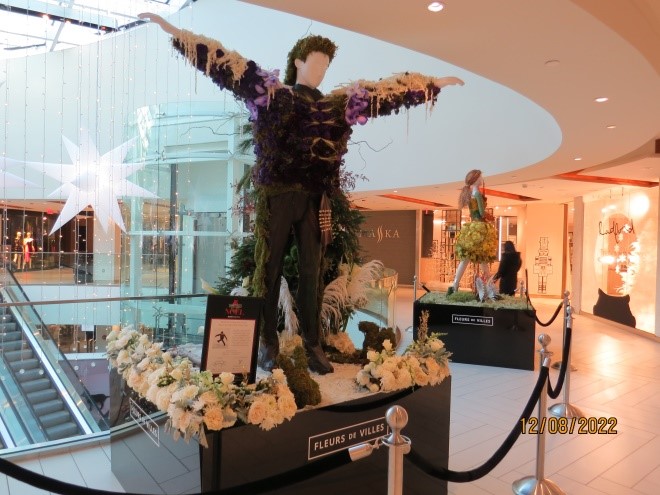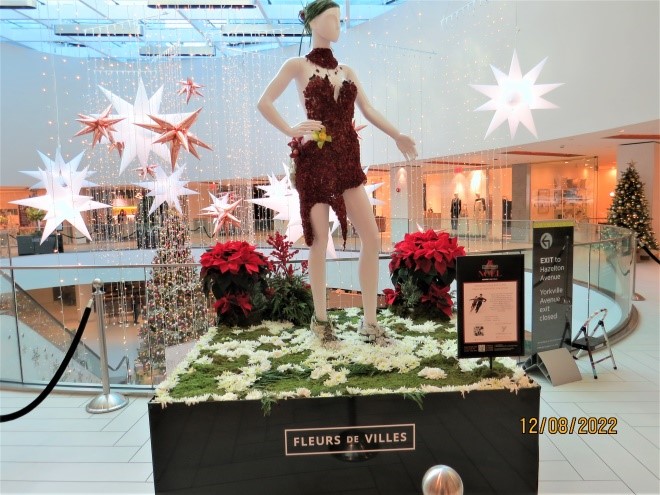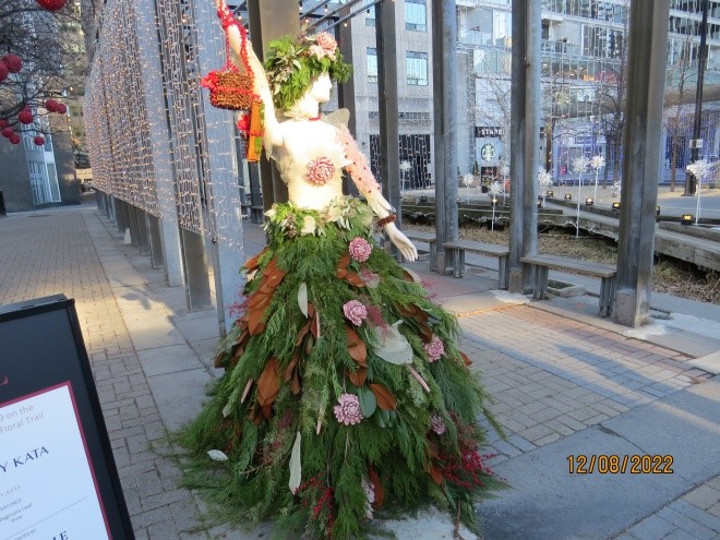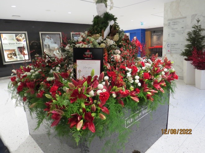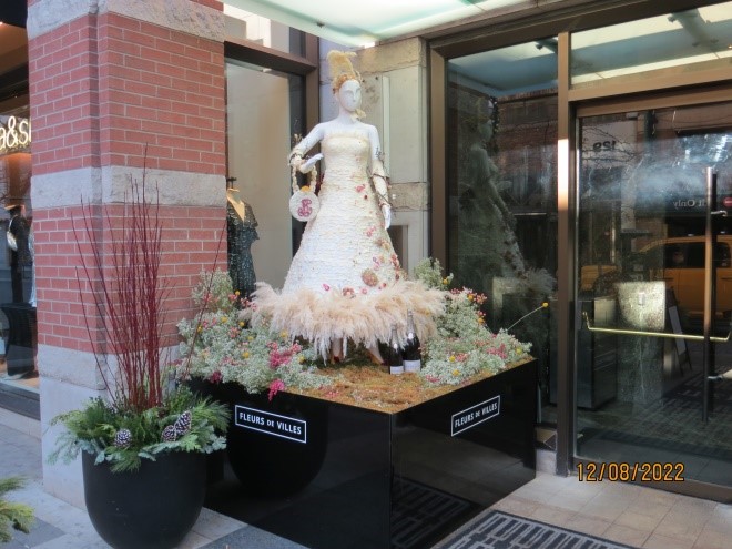 In early December, the Walking Club visited the Yorkville area of Toronto to view more than 30 floral installations called Fleurs de Villes, featuring the works of Toronto’s favourite florists. I had seen an ad for this event on the subway but didn’t have any details. Members of the Walking Club were pleasantly surprised and greatly impressed by the beauty displayed and the work involved in setting up these items. It has been difficult to choose representative photos of the works, but I have managed to choose some of the best for your viewing pleasure.