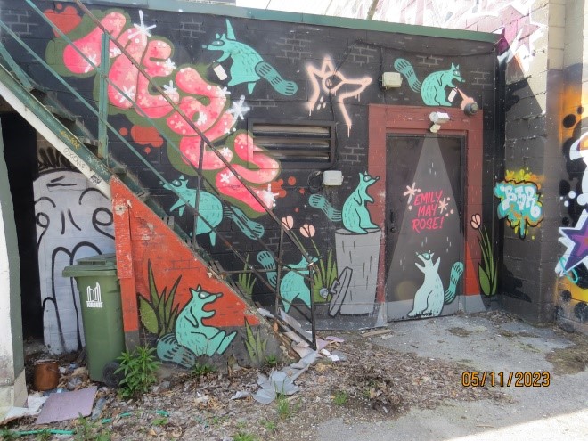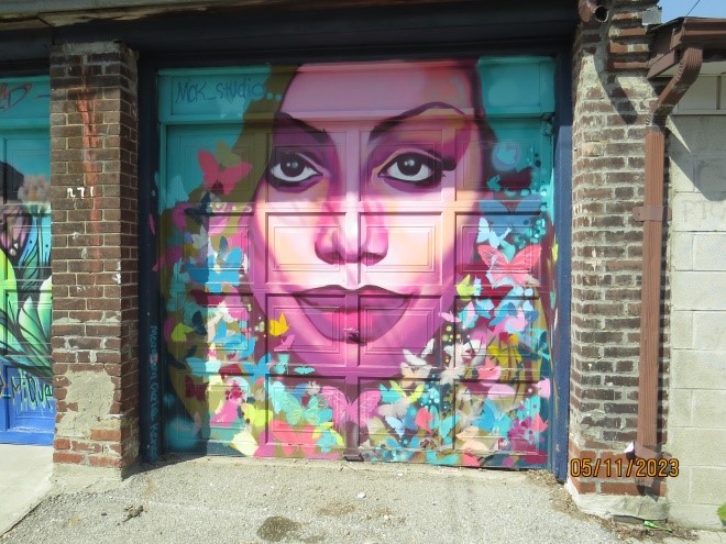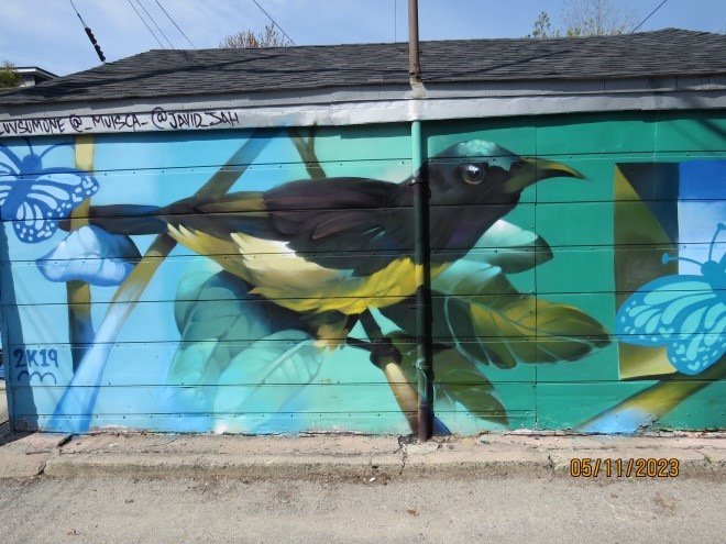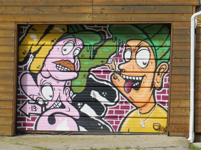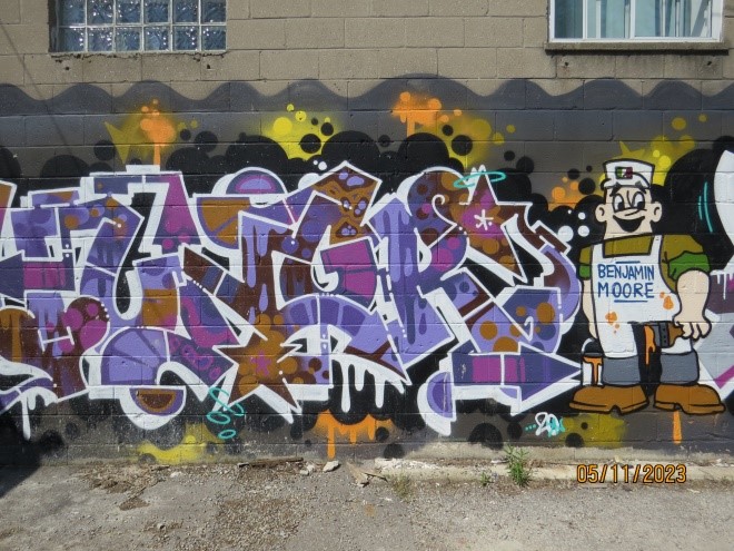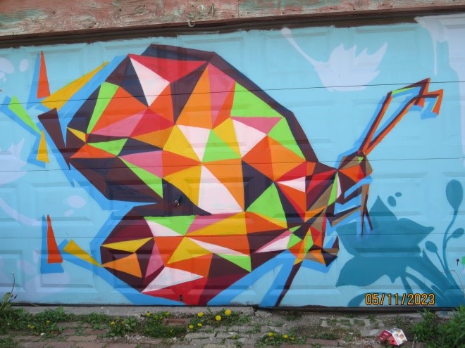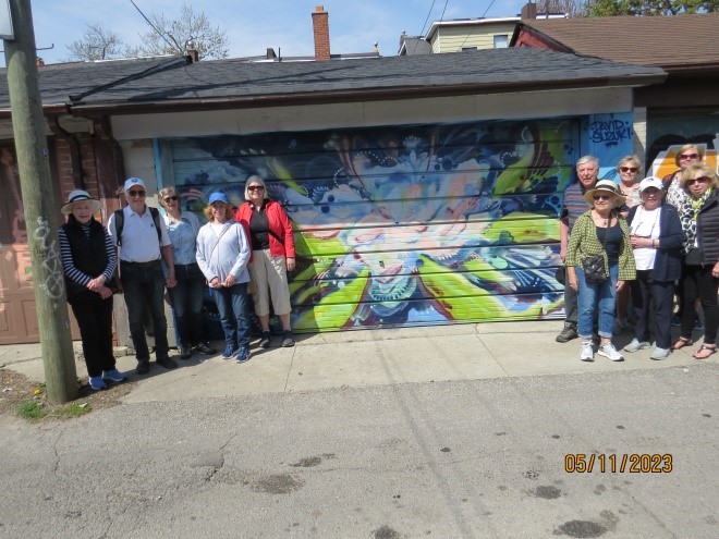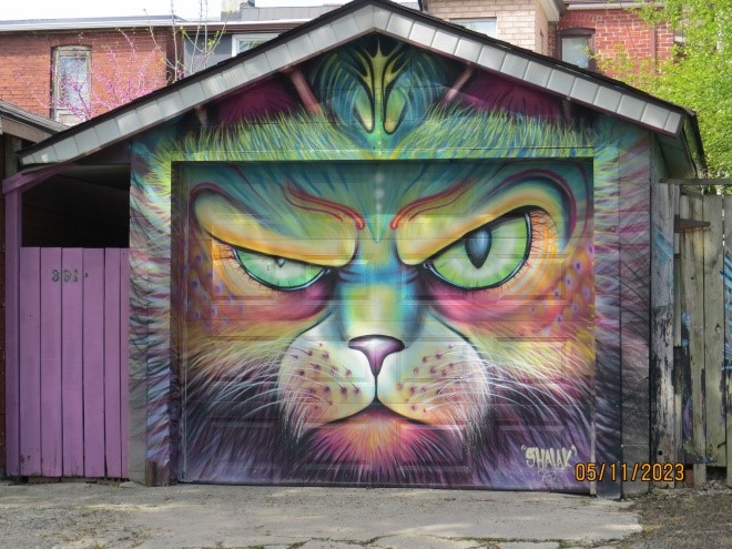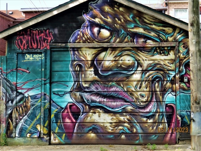 The walk being submitted for September 2023, occurred in May, when the Walking Club took a walk through west-central Toronto to see if we could find any graffiti worth admiring. Many of these works of art are found on garage doors which necessitates a tour of the back lanes of the city. These graffiti are not the careless spraying of paint by some juvenile who wants to make a mark in the neighbourhood; rather, they are works of art created by some very talented people. It amazes me what they can do with paint in spray cans when, even if I am careful spraying a chair, the paint goes all over the place.