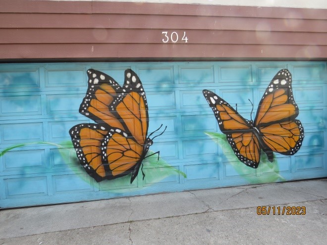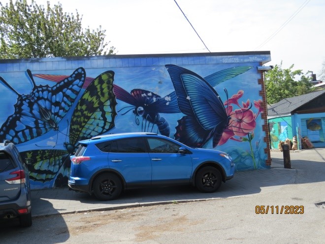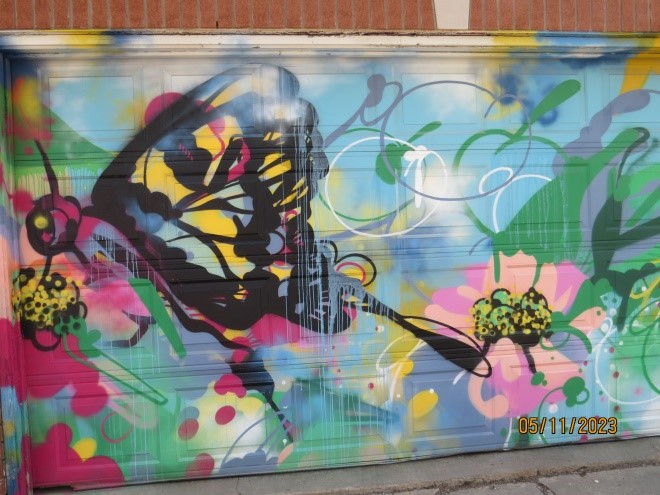 We then walked one block east on Harbord to Grace St., crossed the road and just west of Grace found another back alley lined with decorated garages. Butterflies seemed to be a popular subject for the artists.