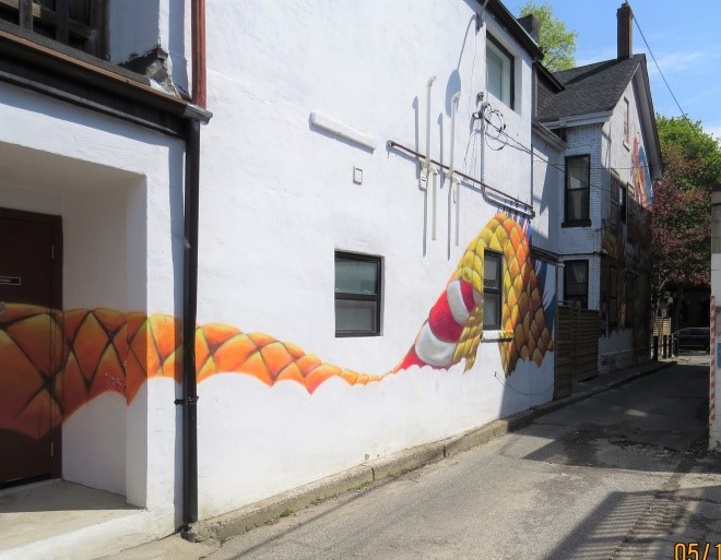Many of the murals were at the rear of College St. businesses. This one is in back of a paint store.