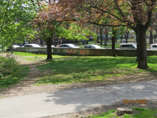 The lane ends at Harbord St. where we saw the old bridge that passes over Garrison Creek, now filled in.