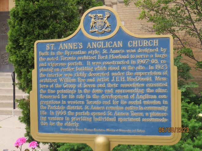 The tour was so extensive, informative, and fascinating, that we lost track of time and ended the walk at the church. The rest of Dundas St. down to the city centre will have to wait for another day. If you are at all interested in Canadian art, try to arrange a visit to St. Anne’s church and, I am sure, you will be amazed at the art treasures housed in this special building.