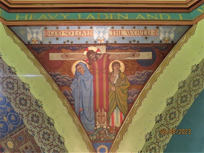 As a special treat, I had arranged for a guide to meet us at the church to give us a tour of the artwork contained inside. This church is a National Historic Site, containing works by J. E. H. MacDonald, Frederick Varley, and Franklin Carmichael, all members of the Group of Seven painters. There are also medallion sculptures by Frances Loring, who, I believe, created the Lion Monument that used to mark the beginning of the Queen Elizabeth Way.
