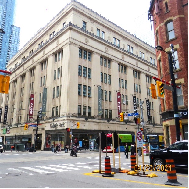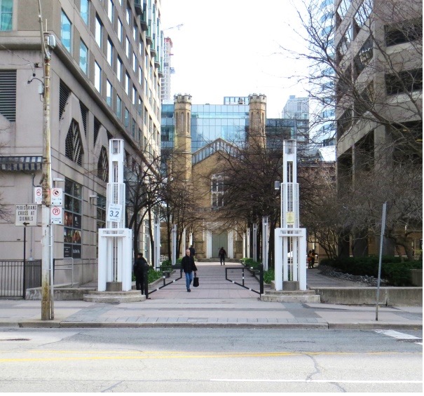 Just south of College St. is the arch from the now-demolished St. Andrew’s United Church on Bloor Street.