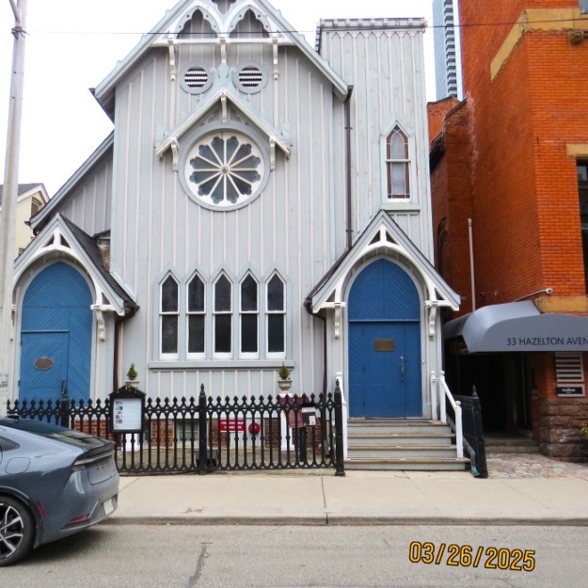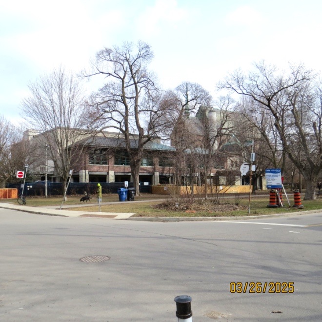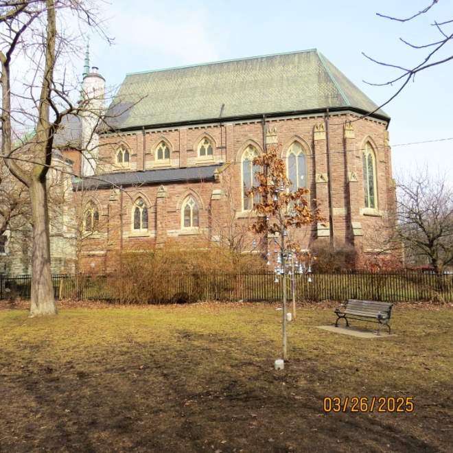 In the background, barely visible, is part of the building that replaced the old Honest Ed’s store. One block east, we turned up Albany Avenue toward St. Alban’s square. This hidden area of Toronto was once destined for great things. In the late 1800s, the Anglican bishop of Toronto proposed building a great new cathedral for the church, and he chose this site. As you probably know, it takes many years to build a cathedral, sometimes centuries. The project moved along until World War I, when resources had to be diverted elsewhere and the project languished. Construction resumed but was soon halted again by the Great Depression and was eventually abandoned. The foundations and the choir were already in place and the existing parts became St. Andrew’s Japanese congregation. When that congregation dwindled, a private boys’ choir school, Royal St. George’s College was established that used the existing buildings. Since then, further building has taken place on the original foundations to provide more classrooms.