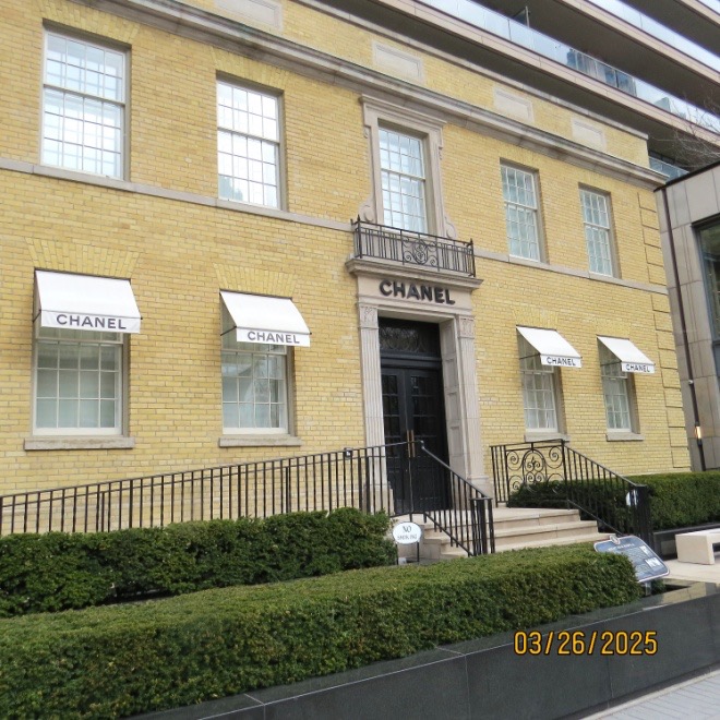 Walking along Yorkville Ave., we came to the orginal Mt. Sinai hospital building which has luxury condos built over top and a Chanel boutique on the ground floor. We tried to take a group photo but the concierge chased us away.