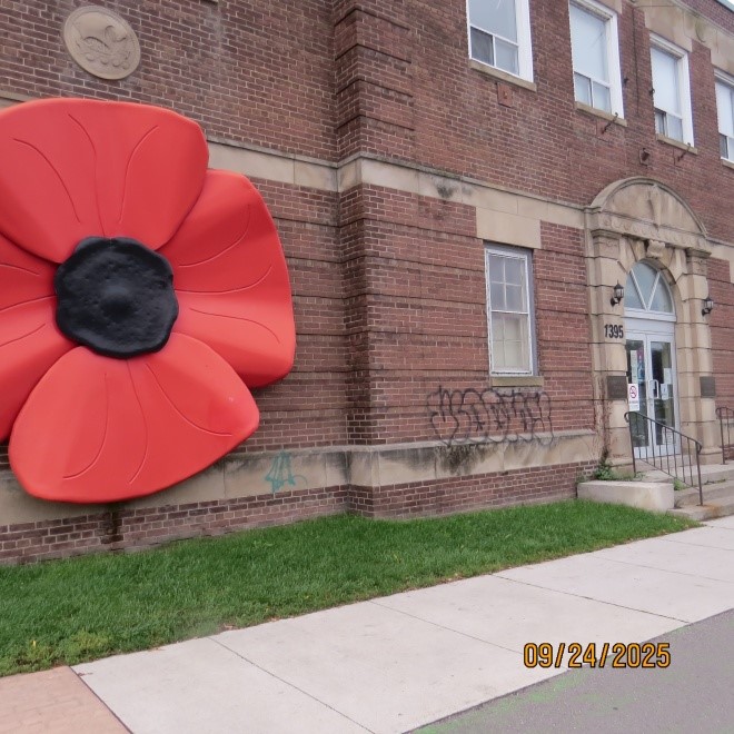 Going slightly uphill over the shore of ancient Lake Iroquois, we find a branch of the Royal Canadian Legion with its huge poppy logo.