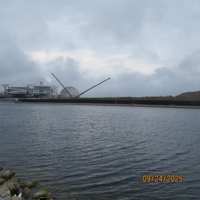 After Marilyn Bell park, lies Ontario Place. We have all heard about the Ontario Government’s intention to install a luxe spa there, a move that involved cutting down hundreds of mature trees on the west island. It was interesting to see the “progress” that is being made. This is the island that contained the flume ride and the silos that showcased the Ontario government.